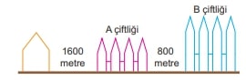 Bir çiftçi A ve B çiftliklerindeki sütleri toplamak için, sabahları mandıradan hareket ediyor. Çiftçi saatte 8km sabit hızla süt toplama aracıyla hareket ediyor ve yalnızca çiftilklerde zaman kaybediyor. Yolda zaman kaybetmiyor. Yukarıda gösterildiği gibi aynı yol üzerinde bulunan mandıra ile A çiftliği arasındaki uzaklık 1600, A çiftliği ile B çiftliği arasındaki uzaklık 800 metredir.