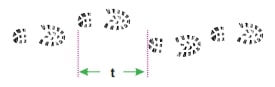 Resimde, kumsalda ayakkabısıyla yürüyen bir erkeğin ayak izleri görülmektedir. Adım uzunluğunu gösteren t, ardışık iki ayak izinin topukları arasındaki uzunluktur.