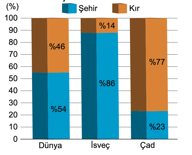 Aşağıda Dünya ve bazı ülkelerdeki şehir ve kır nüfus oranları verilmiştir.
