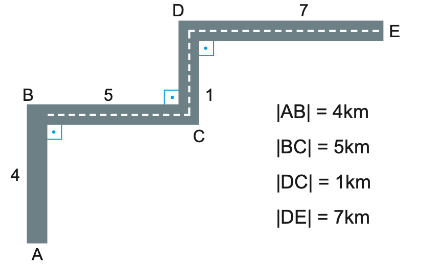 Bir belediye sokakları dik kesişen A ve E köşeleri arasındaki dört sokak yerine tek bir [AE] geçiş tüneli inşa etmek istiyor.