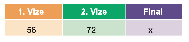 Sinem’in bu dersteki başarı notu 69 olduğuna göre x ile gösterilen final notu aşağıdakilerden hangisidir?