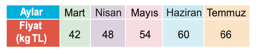 Aşağıdaki tablo, 1 kg dana etinin aylara göre fiyatlarında meydana gelen değişimi göstermektedir.