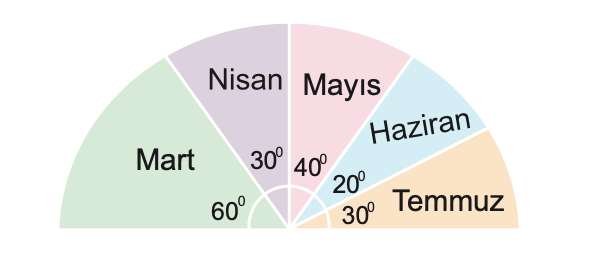 Aşağıdaki grafik, Mazlum'un evinde 5 ayda tüketilen toplam 18 kg etin aylara dağılımını gösteren yarım daire grafiğidir.
