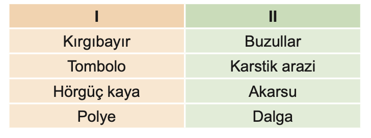 Yukarıda I. kısımda bazı yer şekilleri II. kısımda oluşumlarında etkili olan dış kuvvetler verilmiştir. Verilen yer şekilleri oluşumlarında etkili olan faktörlerle eşleştirilmek isteniyor.