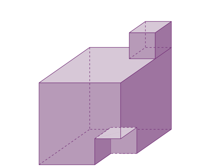 Şekildeki bir ayrıtı 10 birim olan küpün köşesinden bir ayrıtı 4 birim olan küp çıkartılıyor ve küpün üst yüzeyinde tam köşeye gelecek şekilde konuyor.