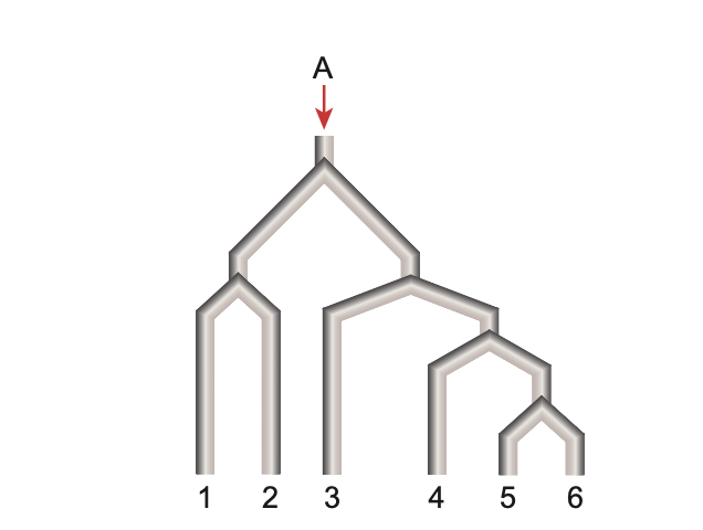 Yukarıdaki düzenekte A noktasından bırakılan belli sayıdaki bilyeler her yol ayrımında eşit şekilde ikiye ayrılarak yollarına devam ediyor ve düzeneğin altındaki altı çıkıştan da çıkıyorlar.