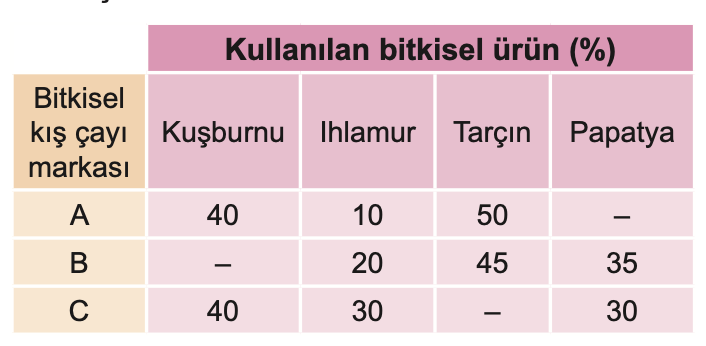 Buna göre A, B ve C marka bitkisel kış çayı karışımından eşit miktarlarda karıştırarak kullanan bir kişinin elde ettiği karışımdaki ıhlamur oranı yüzdesi kaçtır?
