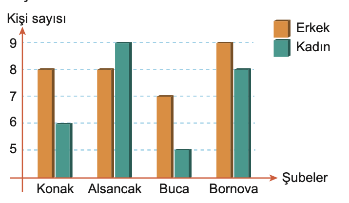Dört şubesi olan bir mağazanın, şubelerinde çalışan erkek ve kadın personelin sayısını gösteren grafik aşağıda verilmiştir.