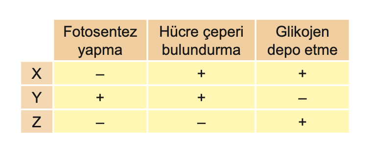 Yukarıdaki tabloda özellikleri verilen X, Y, Z canlıları hangisinde doğru verilmiştir?