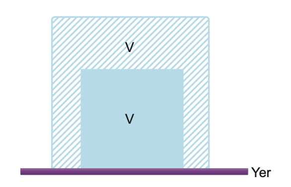 Hacmi 2V olan küp şeklindeki bir buz kalıbı yerde dengededir. Sıcaklık artırılarak buz kalıbının taralı kısmı eritiliyor. Son durumda buzun yarısı eriyerek şekildeki gibi küçülüyor.