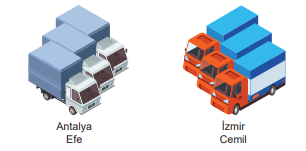 Farklı kargo firmasında yükleme sorumlusu olarak Antalya’da çalışan Efe ile İzmir’de çalışan Cemil, aynı büyüklükteki kutuları kendi şubelerindeki eş değer üç araca yükleyeceklerdir.