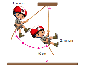 Çocuk sallanırken düşey konuma geldiğinde yerden 40 cm yükseklikte olmakla beraber görseldeki konumundan 100 cm ve yatayda da 80 cm yer değiştirmiştir.