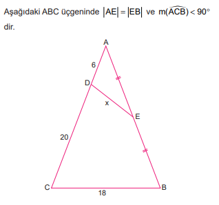 Ayrıca |AD| = 6 birim , |DC| = 20 birim ve |CB| = 18 birim olduğuna göre |DE| = x değerinin alabileceği kaç tam sayı değeri vardır?