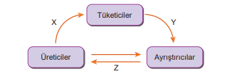 Yukarıdaki şemada doğadaki madde döngüsünü sağlayan üretici, tüketici ve ayrıştırıcılar arasındaki ilişki gösterilmiştir.