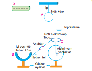Önel adlı öğrenci negatif yüklü X iletken çubuğunu yalıtkan bir eldiven ile tutup nötür iletken A küresine yaklaştırır, yeterince bekler ve A küresi ile topraklama bağlantısını keser. X iletken çubuğunu ortamdan uzaklaştırır, A küresini yine yalıtkan eldiven ile tutup A küresini içi bos iletken küresinin içine dokundurup ayırır. Biraz bekledikten sonra iletken küre ile elektroskop arasındaki anahtarı açar ve A küresini ortamdan uzaklaştırır.