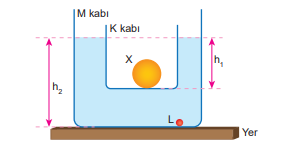 M kabının içine yerleştirilmiş K kabındaki X cisminin denge durumu şekildeki gibi verilmiştir. X cisminin özkütlesi sıvının özkütlesinden büyüktür.