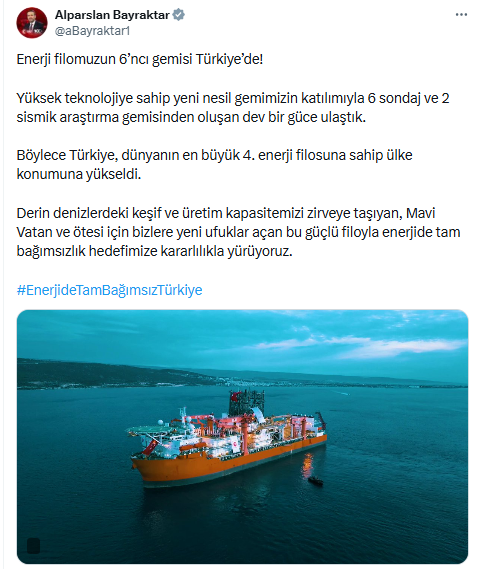 Derin denizlerdeki keşif ve üretim kapasitemizi zirveye taşıyan, Mavi Vatan ve ötesi için bizlere yeni ufuklar açan bu güçlü filoyla enerjide tam bağımsızlık hedefimize kararlılıkla yürüyoruz”