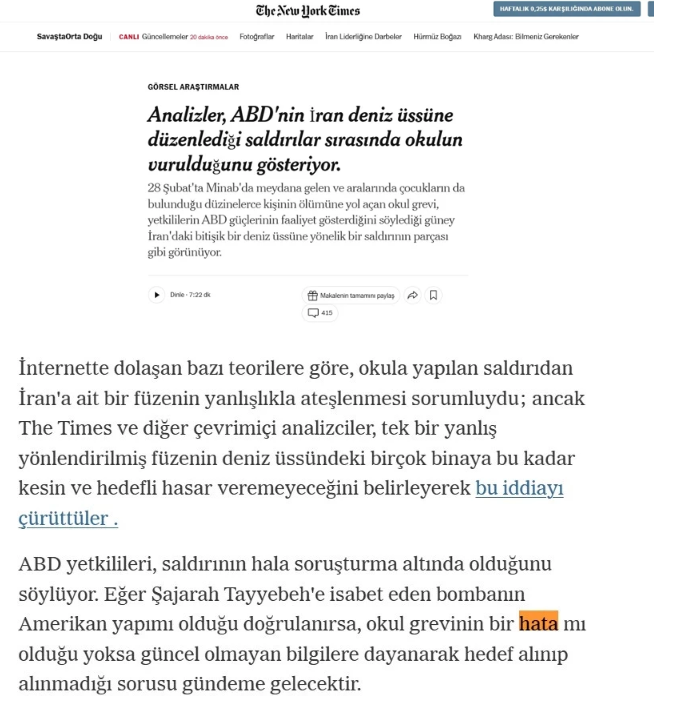 22'nci gününde devam eden savaşın ilk gününde İran'daki Minab İlkokulu 'üç füze saldırısı'yla hedef alınmıştı. Yapılan saldırı sonucunda 168 ilkokul öğrencisinin yaşamını yitirdiği ortaya çıkarken geriye ise vicdanları sızlatan kazılmış haldeki mezarların fotoğrafı kalmıştı.