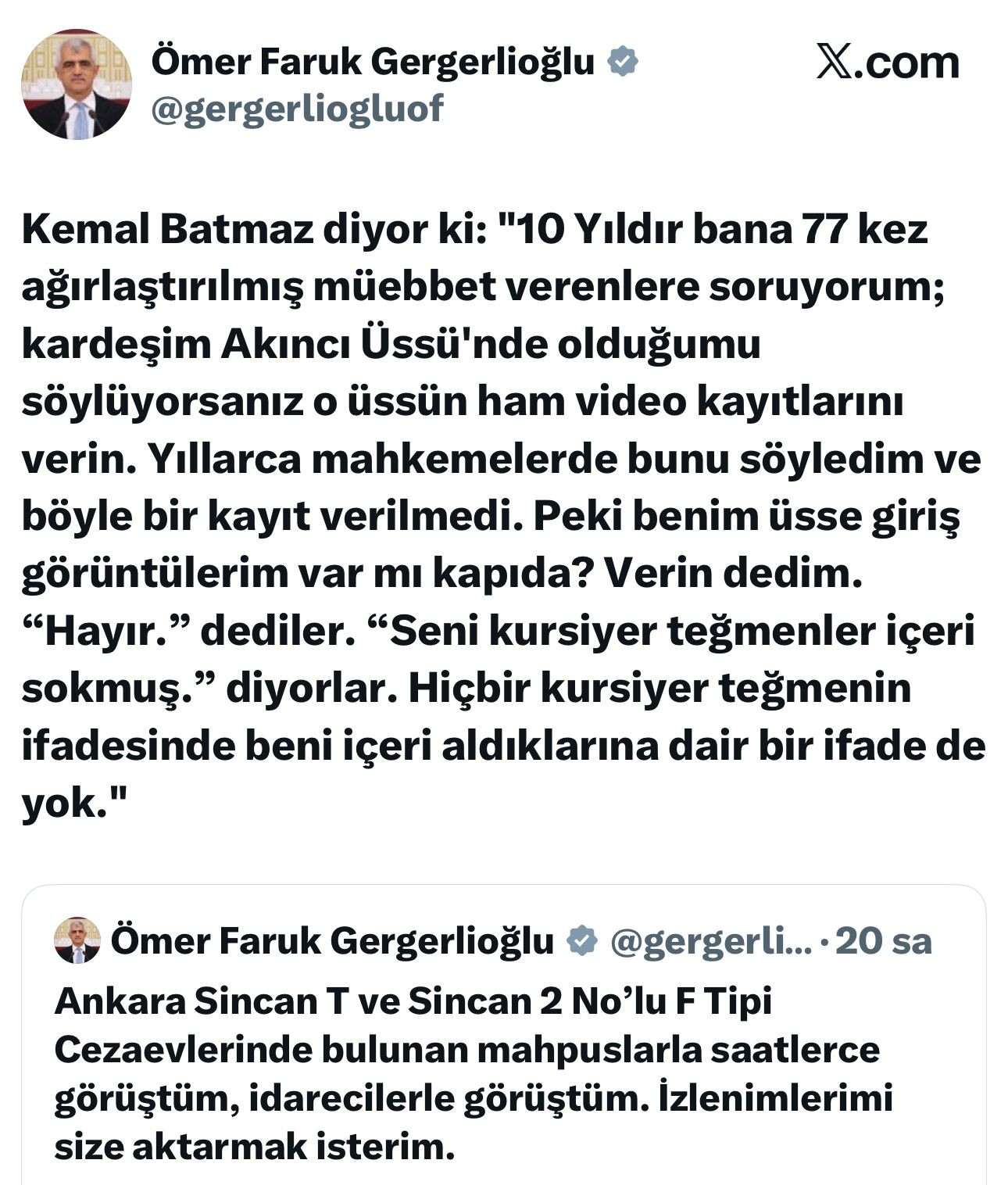 Terör suçlularını ziyaret eden DEM Partili Ömer Faruk Gergerlioğlu, Batmaz’ın sözlerini sosyal medya hesabından paylaşarak "mağduriyet" edebiyatı yaptı.