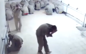 Görüntülerin bir bölümünde, bekleme odası olarak nitelendirilen kapalı bir alanda 20'den fazla kişinin zemine çömelmiş halde bekletildiği görülüyor.