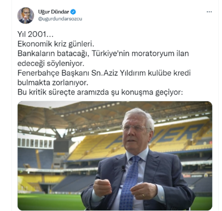 Dönemin başkanı Aziz Yıldırım'ın videosunu paylaşan Dündar, mesajına, "Yıl 2001. Ekonomik kriz günleri. Bankaların batacağı, Türkiye'nin moratoryum ilan edeceği söyleniyor. Fenerbahçe Başkanı sayın Aziz Yıldırım kulübe kredi bulmakta zorlanıyor. Bu kritik süreçte aramızda şu konuşma geçiyor." notunu düştü.