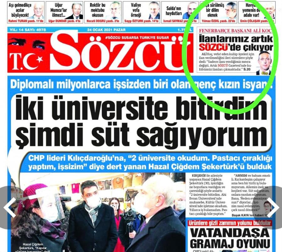 Can Dündar yönetimindeki Cumhuriyet gazetesine, diğer tüm gazetelere verdikleri reklamdan daha fazla reklam yağdıran Koç ailesi, “Biz Can Dündar’ın Cumhuriyet gazetesindeki yönetiminin, FETÖ tarafından dizayn edildiğini bilmiyorduk. MİT Tırları yalanları Cumhuriyet’te yayınlanırken, biz de o gazeteyi reklama boğuyorduk ama bizim kastımız Erdoğan’ın devrilmesi değildi. Cumhuriyet gazetesinde PKK güzellemeleri yapılırken, bizim şirketlerimizin reklamları, tam sayfa tam sayfa o gazetede yayınlanıyordu.. Ama bizim PKK’yı güzelleyen bu gazeteye verdiğimiz desteğin yanlış anlaşılmasını kesinlikle kabul etmiyoruz” diyebilirler mi?