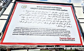 Göreve geldiğinden bu yana göçmenlere, hatta şehir dışından gelen öğrencilere bile ayrımcılıklar uygulayan CHP’li Bolu Belediye Başkanı Tanju Özcan’ın ‘Nazi’ ağzıyla kaleme alıp Türkçe ve Arapça olarak astırdığı afişlerde aynen şu ifadeler yer alıyordu: “Geçici sığınmacılara sesleniyorum. 11 yıl önce ülkemize misafir olarak geldiğinizi söylediniz. Türk milleti de kıt kaynaklarıyla size yıllardır sahip çıkıyor. Artık bu misafirlik fazla uzadı… Sizinle paylaşacak ekmeğimiz ve suyumuz kalmadı. Geldiğiniz gibi gitme zamanınız geldi. Artık istenmiyorsunuz. Dönün ülkenize…”