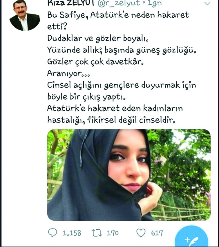 “Bu Safiye, Atatürk’e neden hakaret etti? Dudaklar ve gözler boyalı. Yüzünde allık; başında güneş gözlüğü… Gözler çok davetkâr… Aranıyor… Cinsel açlığını gençlere duyurmak için böyle bir çıkış yaptı. Atatürk’e hakaret eden kadınların hastalığı, fikirsel değil cinseldir.”