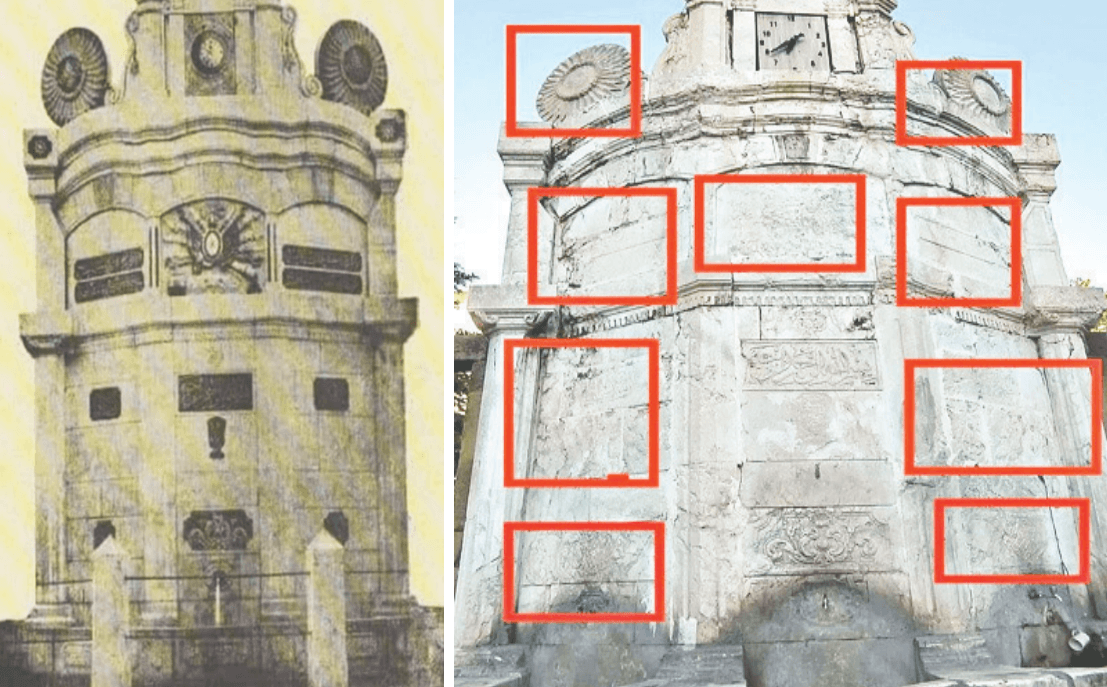 Hazin hadiselerden biri de Yozgat’ta yaşandı. Sultan 2. Abdülhamid adına yaptırılan Hamidiye Çeşmesi’nin resmen derisi soyulup çırılçıplak bırakılmış. Ne tuğra kalmış geride, ne devlet arması ne de kitabe ve hemen her çeşmede bulunması adet olan ayetler. Hem eski halini, hem de yeni halini koyuyorum ki cinayetin çapı daha iyi anlaşılabilsin.