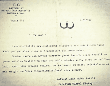 “Gazetelerimizin son günlerden neşriyatı arasında dinden bâhis bazı yazı, mütalaa, ima ve temennilere rastlanmaktadır. Bundan sonra din mevzuu üzerinde gerek tarihî, gerek temsilî ve gerek mütalaa kabilinden olan her türlü makale, bend, fıkra ve tefrikaların neşrinden tevakki edilmesi (kaçınılması) ve başlanmış bu kabil tefrikaların en çok on gün zarfında nihayetlendirilmesi rica olunur.”