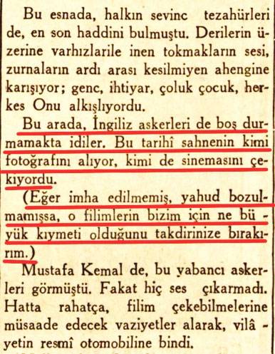 “Bu arada İngiliz askerleri de boş durmamakta idiler. Bu tarihî sahnenin kimi fotoğrafını alıyor, kimi de sinemasını çekiyordu. (…) Mustafa Kemal de, bu yabancı askerleri görmüştü. Fakat hiç ses çıkarmadı. Hatta rahatça film çekebilmelerine müsaade edecek vaziyetler alarak, vilâyetin resmî otomobiline bindi.”