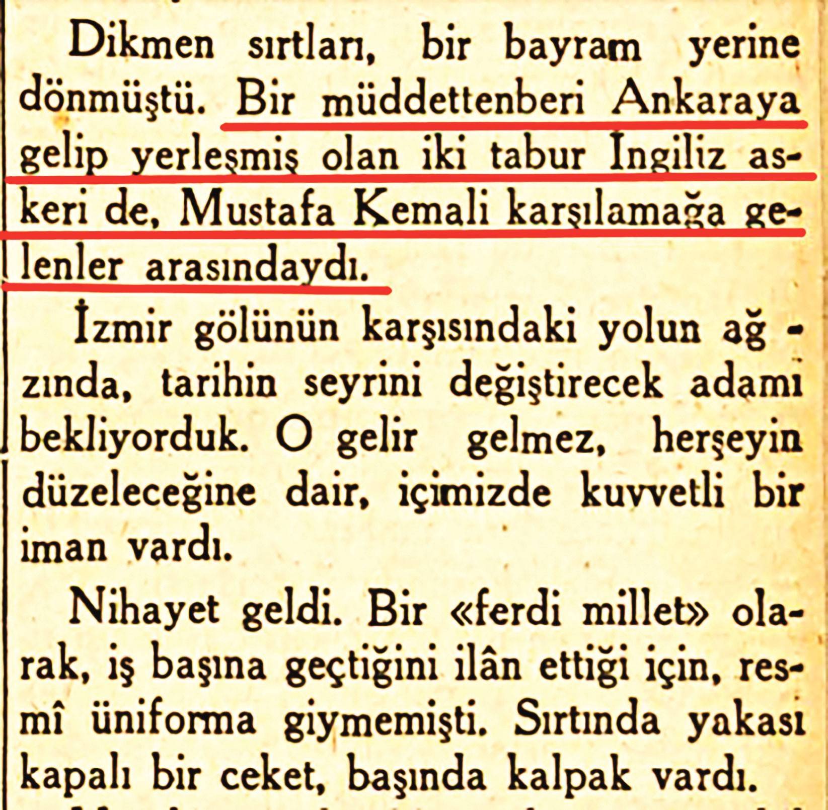 “Dikmen sırtları, bir bayram yerine dönmüştü. Bir müddetten beri Ankara’ya gelip yerleşmiş olan iki tabur İngiliz askeri de, Mustafa Kemal’i karşılamağa gelenler arasındaydı.”