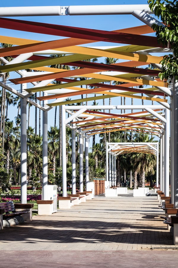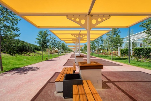 Serge Ferrari ürünleri, uygulama kolaylığı ve çelik maliyetini azaltmasının yanı sıra tasarımları ve göz alıcı renkleriyle dikkat çekiyor. UV direnci oldukça yüksek olan ürünler, ziyaretçileri güneşin zararlı ışınlarından korurken, doğal ortamı bozmadan gölgelendirme yapılabilmesini sağlıyor.