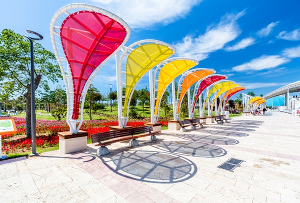 Antalya EXPO 2016’da ARTI Mimarlık ve KOBA Proje Mühendislik firması tarafından tasarlanan Çocuk Adası, Şakayık Terası, Botanik Parkı’nın yanı sıra, dış cephe düzenlemesi, yürüyüş yolu gölgelikleri ve otobüs durakları için Serge Ferrari’nin geniş ve işlevsel ürün yelpazesi tercih edildi.