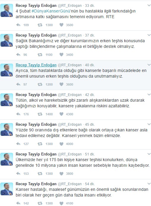 Cumhurbaşkanı Erdoğan: Kanser hastalığı, maalesef günümüzün en önemli sağlık sorunlarından biri olarak her geçen gün daha fazla insanı etkiliyor. Ülkemizde her yıl 175 bin kişiye kanser teşhisi konulurken, dünya genelinde 10 milyona yakın insan kanser sebebiyle hayatını kaybediyor. Yüzde 90 oranında dış etkenlere bağlı olarak ortaya çıkan kanser asla tedavi edilemez değildir. Kanseri yenmek bizim elimizde. Tütün, alkol ve hareketsizlik gibi zararlı alışkanlıklardan uzak durarak sağlığımızı koruyabilir, kansere yakalanma riskini azaltabiliriz. Ayrıca, tüm hastalıklarda olduğu gibi kanserle başarılı mücadelede en önemli unsurun erken teşhis olduğunu da unutmamalıyız." dedi.