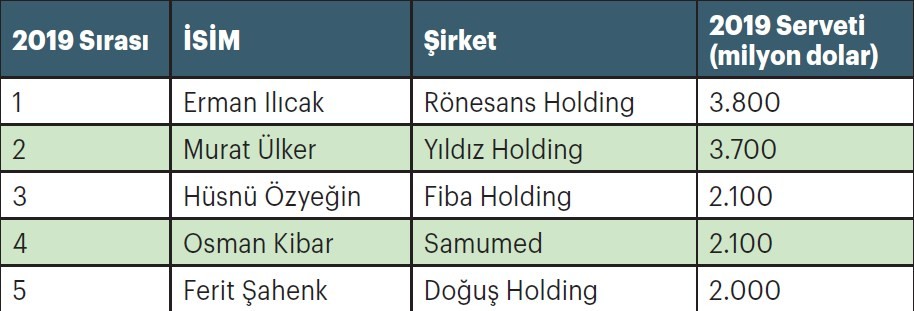 Listenin ilk sırasında 3,8 milyar dolarlık servetiyle Rönesans Holding Başkanı Erman Ilıcak yer alıyor. Son beş yılın “en zengini” Yıldız Holding ve Godiva Yönetim Kurulu Başkanı Murat Ülker ise 3,7 milyar dolarlık servetiyle ikinci sıraya geriledi. Üçüncülüğü 2,1 milyar dolarlık servetleriyle Fiba Holding Yönetim Kurulu Başkanı Hüsnü Özyeğin ve biyoteknoloji şirketi Samumed’in kurucusu Osman Kibar paylaştı.