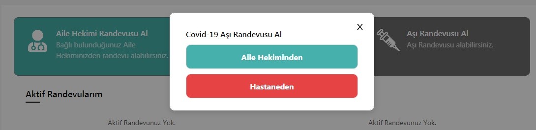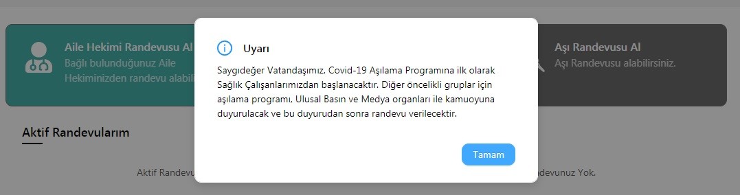 Aşı Randevusu Al kısmına tıkladığınızda şayet sağlık çalışanıysanız randevunuz oluşturulacaktır. Sağlık çalışanı değilseniz, “Saygıdeğer Vatandaşımız, Covid-19 Aşılama Programına ilk olarak Sağlık Çalışanlarımızdan başlanacaktır. Diğer öncelikli gruplar için aşılama programı, Ulusal Basın ve Medya organları ile kamuoyuna duyurulacak ve bu duyurudan sonra randevu verilecektir” ifadesiyle karşılaşacaksınız.