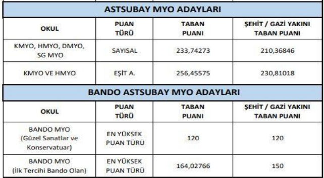 Astsubay Meslek Yüksekokulları YKS puanı kaç?