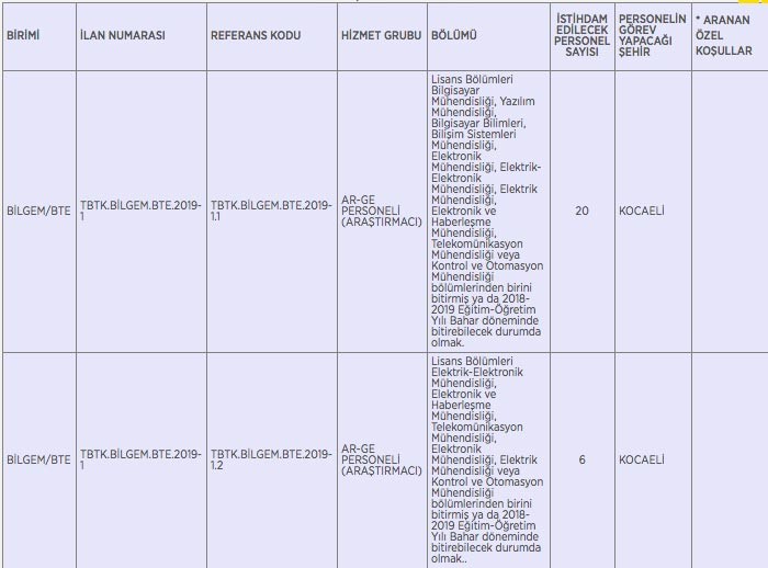 TÜBİTAK personel alımı 2019! TÜBİTAK Bilişim Teknolojileri Enstitüsü'ne (BİLGEM/BTE) 142 Proje Personeli (Araştırmacı - Teknisyen) alıyor. Başvurular için gerekli koşullar ve süreçler Kurumumuz internet sayfasında (www.tubitak.gov.tr), Devlet Personel Başkanlığının ve Türkiye İş Kurumunun internet sayfalarında yer almaktadır. İş Başvuruları TÜBİTAK İş Başvuru Sistemi (https://kariyer.sage.tubitak.gov.tr) üzerinden gerçekleştirilmektedir.
